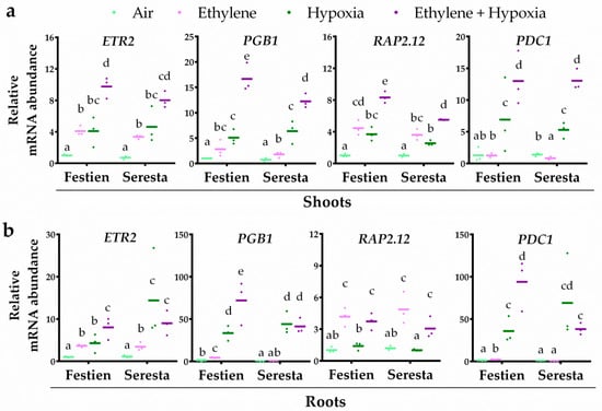 Ethylene differentially modulates hypoxia-responsive transcripts in the roots of elite potato cultivars. Relative mRNA transcript abundance of four marker genes for ethylene-mediated hypoxia tolerance in shoot (a) and root tissues (b) of the potato cultivars Festien (waterlogging tolerant) and Seresta (waterlogging sensitive) after 4 h of pre-treatment with air (light green) or ~5 μL L−1 ethylene (pink), followed by (4 h) hypoxia (green and purple). Marker genes are orthologues of the Arabidopsis genes: ethylene signaling gene ETR2, NO-scavenging phytoglobin PGB1, ERFVII transcription factor RAP2.12 and hypoxia adaptive gene PDC1. Values are relative to air treated samples of Festien. Different letters indicate significant differences (p < 0.05, 2-way ANOVA, Tukey’s HSD, n = 3 containing 2 shoot meristems (a) or ~10 root tips (b)).