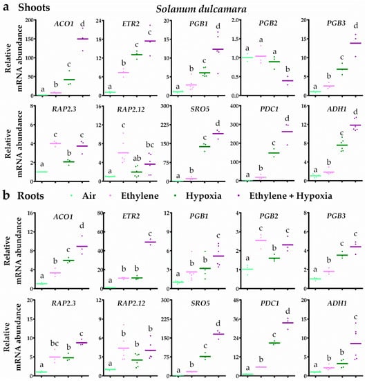 Ethylene augments hypoxia-responsive transcripts in bittersweet. Relative mRNA transcript abundance of 10 marker genes for ethylene-mediated hypoxia tolerance in bittersweet (S. dulcamara) shoot (a) and root tissues (b) after 4 h of pre-treatment with air (light green) or ~5 μL L−1 ethylene (pink), followed by (4 h) hypoxia (green and purple). Marker genes are orthologues of the Arabidopsis genes: ethylene signaling genes ACO1 and ETR2, NO-scavenging phytoglobins PGB1, PGB2 and PGB3, ERFVII transcription factors RAP2.3 and RAP2.12 and hypoxia adaptive genes SRO5, PDC1 and ADH1. Values are relative to air treated samples. Different letters indicate significant differences (p < 0.05, 1-way ANOVA, Tukey’s HSD, n = three or six biological replicates containing 2–4 shoot meristems (a) or ~10 root tips (b)).