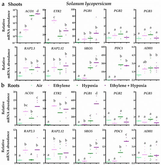 Ethylene rarely enhances hypoxia-responsive transcripts in tomato. Relative mRNA transcript abundance of 10 marker genes for ethylene-mediated hypoxia tolerance in tomato (S. lycopersicum cv MoneyMaker) shoot (a) and root tissues (b) after 4 h of pre-treatment with air (light green) or ~5 μL L−1 ethylene (pink), followed by (4 h) hypoxia (green and purple). Marker genes are orthologues of the Arabidopsis genes: ethylene signaling genes ACO1 and ETR2, NO-scavenging phytoglobins PGB1, PGB2 and PGB3, ERFVII transcription factors RAP2.3 and RAP2.12 and hypoxia adaptive genes SRO5, PDC1 and ADH1. Values are relative to air treated samples. Different letters indicate significant differences (p < 0.05, 1-way ANOVA, Tukey’s HSD, n = three or six biological replicates containing 2–4 shoot meristems (a) or ~10 root tips (b)).