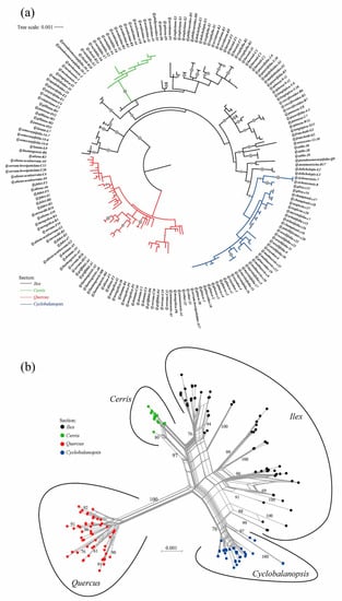 Infrageneric phylogeny of Chinese oak species inferred with (a) maximum likelihood and (b) neighbor-net methods using combined chloroplast–nuclear dataset. The four identified sections in the Chinese oak’s lineage are color-coded. Gray circles on branches of the maximum likelihood tree indicate bootstrap values > 60, and bootstrap confidence > 60 were showed for major clusters on the neighbor-net network.