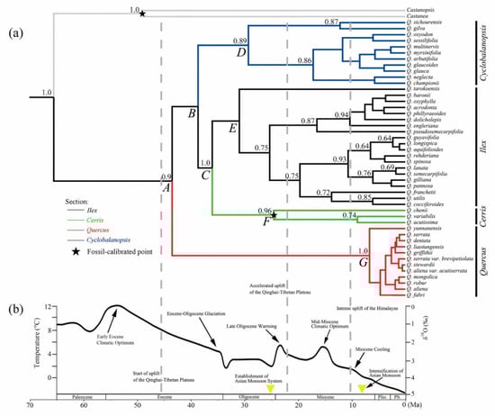 (a) Fossil-calibrated evolutionary history of the Chinese oaks and (b) geohistorical and climate events that possibly impacted on evolution of the Chinese oak’s lineage during the Cenozoic era [,]. Branches of the Bayesian evolutionary tree are colored according to the four identified sections. Black stars indicate fossil-calibrated points used in molecular dating. Posterior probabilities with values > 0.60 are shown near the nodes. Black curve in (b) indicates the global trends of temperature and average oxygen isotope from Paleocene to Pleistocene. Gray dashed lines and yellow triangles mirror the proposed dynamics of the Qinghai-Tibetan Plateau (QTP)-Himalaya and Asian monsoon systems, respectively.