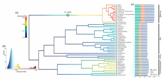 (a) Simulation on the lineage diversification of the Chinese oaks reveals varying diversification rates among the Chinese oak species and an evolutionary shift (Bayesian factor = 0.21) denoted by a gray circle on section Quercus clade. (b) Histogram distribution shows the variant density of speciation rates in Chinese oaks. (c) Bar charts of tip rates (lambda, mu and turnover rates) of lineage diversification for the Chinese oak species on the phylorate tree.