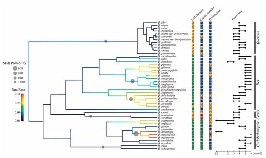 Simulation of the phenotypic evolution of the Chinese oaks suggests heterogeneous rates in trait-based evolution and several phenotypic transitions in the Chinese oak’s lineage. Gray circles on branches denote potential phenotypic shifts with varying Bayesian probabilities. Trait characteristics of the tip species are coded with colored squares as follows: leaf character-deciduous (orange), evergreen (green) and semievergreen (yellow); cupule character-ovate bract (blue), lanceolate bract (orange), subulate bract (red) and ring shaped bract (green); fruiting time-present year (blue) and the following year (orange). Dumbbell charts demonstrate the florescent periods of the tip species on the phylogeny.