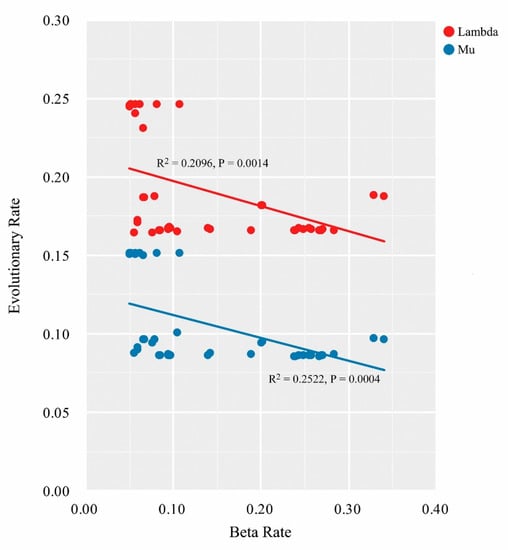 Relationships between the tip rates in the phenotypic evolution (beta rates) and lineage diversification (lambda and mu rates) of the Chinese oak’s lineage under a generalized linear regression.