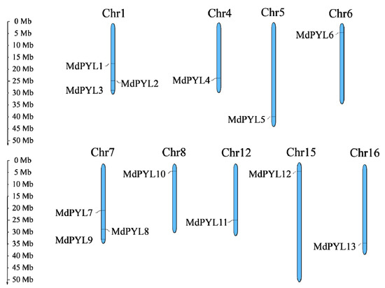 Moreover, according to available annotation information of the GDR database, 13 putative MdPYLs were distributed on nine chromosomes including chromosome 1, 4, 5, 6, 7, 8, 12, 15, and 16 (Figure 1). Three MdPYLs were present on chromosome 1 and 7, respectively, and one MdPYL on the remaining chromosomes (Figure 1).