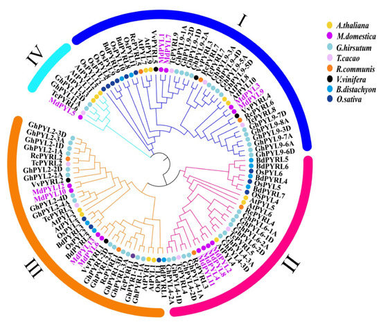 We constructed a phylogenetic tree based on 109 protein sequences of PYLs from seven species, including 14 AtPYLs from A. thaliana, 13 MdPYLs from M. domestica, 7 RcPYLs from R. communis, 5 VvPYLs from V. vinifera, 9 BdPYLs from B. distachyon, 12 OsPYLs from O. sativa, 9 TcPYLs from T. cacao, and 40 GhPYLs from G. hirsutum (Table S1) via MEGA7 software using the neighbor-joining algorithm. In general, the 109 plant PYLs tested were classified into four subgroups and named as group I–IV (Figure 2, Tables S1 and S2). However, the plant PYL family evolutionary relationship was diverse in various species of plants. As expected, MdPYLs from apple generally showed closer genetic relationships to PYLs of dicotyledonous angiosperms (V. vinifera, A. thaliana, G. hirsutum, R. communi, and T. cacao) than monocotyledonous angiosperms (O. sativa and B. distachyon) (Figure 2). The results suggested plant PYLs classifying into the same groups might have similar functions.