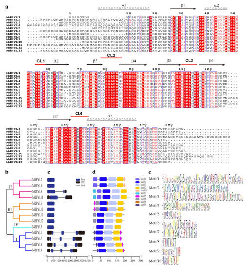 Amino acid sequence alignment, phylogenetic relationships, gene structure, and conserved motifs of MdPYLs. (a) Amino acid sequence alignment and secondary structural elements of the 13 MdPYLs. CL1–CL4 shown with red lines represent four conserved ABA receptor regions. (b) The phylogenetic tree of MdPYLs. Bars of different colors represent different groups of PYLs. (c) Exon–intron structure of apple MdPYLs. Black boxes denote untranslated regions; blue boxes denote exons; black lines denote introns. (d) Distributions of ten conserved motifs in MdPYLs. (e) The sequence logos of ten conserved motifs.