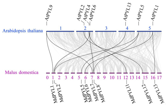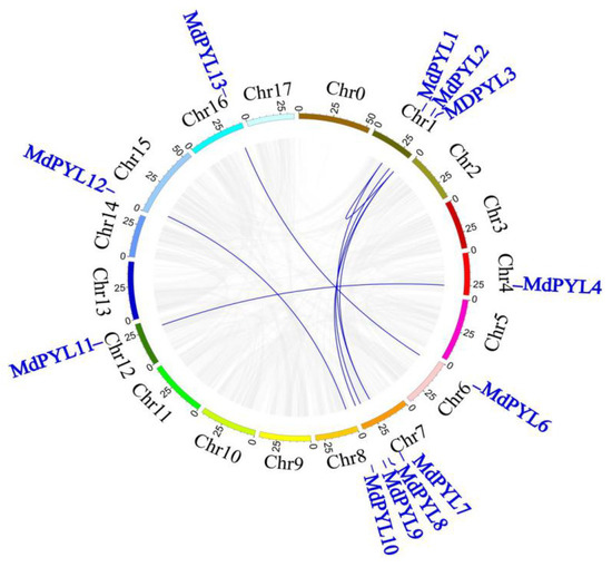 The synteny analysis of MdPYLs in the apple. Gray lines denote all synteny blocks in the apple genome, and the blue lines denote MdPYL duplicated gene pairs.