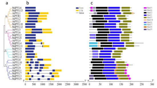 Phylogenetic relationships, gene structure, and conserved motifs of MdPYLs and AtPYLs. (a). The phylogenetic tree of PYLs from the apple and Arabidopsis. Bars of different colors represent different groups of PYLs. (b). Exon–intron structure of MdPYLs and AtPYLs. Yellow boxes denote untranslated regions; blue boxes denote exons; black lines denote introns. (c). Distributions of ten conserved motifs in MdPYLs and AtPYLs.