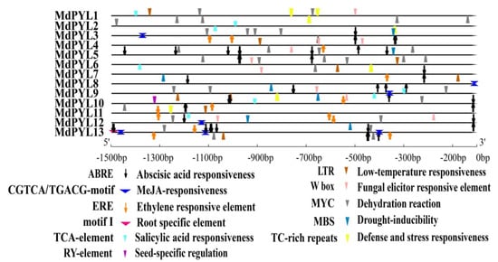 Previous works have indicated that many MdPYLs involved in the response to different abiotic stresses. To further forecast the potential functions of MdPYLs, we analyzed the cis-acting elements involved in abiotic stresses responses in the MdPYLs promoter regions using PlantCARE software (Table S3,S4). In total, three abiotic stress-related and four hormone-related elements were discovered in the promoter of 13 MdPYLs, including drought-inducibility elements (MBS), defense and stress-responsive elements (TC-rich repeats), dehydration reaction elements (MYC), low-temperature-responsive elements (LTR), abscisic acid-responsive elements (ABRE), salicylic acid-responsive elements (TCA-element), ethylene-responsive elements (ERE), and MeJA-responsive elements (CGTCA-motif, TGACG-motif) (Figure 7). All MdPYLs promoter regions contained at least three cis-elements (Figure 7). For example, the MdPYL7 promoter had seven stress-responsive elements including ABRE, MBS, MYC, LTR, TC-rich repeats, CGTCA, and TCA-element (Figure 7). The MdPYL13 promoter region contained six stress-responsive elements including ABRE, MBS, MYC, LTR, ERE, and CGTCA-element. Moreover, the MdPYL2, 5, 8 promoter included three, the MdPYL1, 6, 7, 10, 11 promoter comprised four, and the MdPYL3, 4, 12 promoter contained five stress-responsive elements. Furthermore, the MdPYLs promoter had two tissue-specifc cis-elements (root-specific regulatory element and seed-specific regulation element) (Figure 7). The results concluded that the expression of MdPYLs with different cis-elements may differ in response to various abiotic stresses.