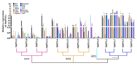 In general, the apple MdPYLs exhibited qualitatively and quantitatively distinct expression profiles. However, MdPYLs clustered to the same group, especially the eight pairs of genes in duplicated genomic regions, showed similar expression patterns, respectively (Figure 8), suggesting that they might have similar functions. For example, all MdPYLs within group I, including MdPYL1, MdPYL3, MdPYL7, and MdPYL9, exhibited relatively higher expression levels in all of the tissues tested compared to PYLs in other groups (Figure 8). Thus, we speculated that MdPYLs of the group I might function in the regulation of plant different growing and developmental stages. The function of homologous genes in other species has been studied to support this hypothesis. For instance, AtPYL8 and AtPYL9, which are orthologs of MdPYL1, 7, are involved in controlling root sensitivity to ABA [16]. OsPYL8 and OsPYL9, belonging to group I, were specifically expressed in the rice endosperms and positively regulated by ABA during seed germination [46]. Furthermore, MdPYLs of group II, including MdPYL2, MdPYL4, MdPYL8, and MdPYL11 were preferentially expressed in the root (Figure 8), indicating that these genes might play a role in root development. Indeed, the AtPYL5/AtPYL6 gene, as the ortholog of MdPYL2/MdPYL8, was expressed at the higher levels in root and might play a critical role for the regulation of root growth and root system architecture [5]. In short, these results indicated the diverse biological functions of different PYLs in plant growth and development.