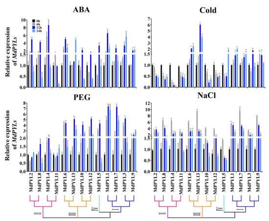 In our study, we found that the expression of almost all of MdPYLs were significantly changed by ABA, PEG, NaCl, and cold. For example, the expression of all MdPYLs except for MdPYL11 exhibited significant increases by ABA treatment (Figure 9). Nine genes (MdPYL1, MdPYL2, MdPYL4, MdPYL5, MdPYL6, MdPYL7, MdPYL8, MdPYL10, and MdPYL12) reached the peak at 12 h after ABA treatment, while three genes (MdPYL3, MdPYL9, and MdPYL13) reached the peak at 24 h. Notably, MdPYL1, MdPYL2, MdPYL3, MdPYL4, MdPYL6, MdPYL8, and MdPYL13 all were upregulated more than fourfold after 12 h or 24 treatment, respectively. Similarly, following with PEG treatment, 10 genes (MdPYL1, MdPYL2, MdPYL3, MdPYL5, MdPYL6, MdPYL7, MdPYL9, MdPYL10, MdPYL12, and MdPYL13) were sharply upregulated in expression after 6 h of treatment and reached the maximum at 12 h, while the expression of remaining three apple MdPYLs had no obvious changes (Figure 9). The expression of all MdPYLs within group I, group III, and group IV were over fourfold higher than CK (0 h) at 12 h after PEG treatment. After NaCl treatment, the expression of all MdPYLs except for MdPYL5 showed significant increases and surged to the peak at 6 h (more than threefold of CK) (Figure 9). Following cold treatment (4 °C), all MdPYLs within group I, and MdPYL6, 13 within group III demonstrated increased expression. More remarkably, MdPYL13 was upregulated more than sixfold after 6 h treatment. In contrast, all MdPYLs within group II, and MdPYL10, 12 within group III were significantly downregulated (Figure 9).