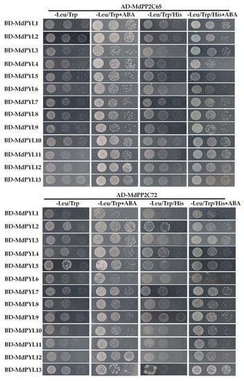 PYLs can interact with PP2Cs to form PYL-ABA-PP2C triple complexes promoting the ABA signals transmission [1]. However, other studies suggested that PYLs can bind PP2Cs in an ABA-dependent or ABA-independent manner in yeast two-hybrid (Y2H) assays [4,12]. In this study, 13 MdPYLs and 2 MdPP2Cs were isolated (Figure S1) to detect their potential interactions in the yeast two-hybrid system. The full coding sequence of all MdPYLs were respectively fused to the DNA-binding domain (BD) of pGBKT7 vector, while two MdPP2Cs were respectively fused with activation domain (AD) of pGADT7 vector. After co-transformed into the Y2H Gold yeast strain, all of yeast cells were capable of growth on SD-Leu/-Trp medium in the absence or presence of ABA. However, the co-transformed yeast cells grew faster in medium with ABA (Figure 10). Interaction between 13 MdPYLs and two MdPP2Cs was determined by growth assay on SD-Leu/-Trp/-His/X-α-Gal/3-AT medium with and without 10 μM ABA. In this experiment, all MdPYLs interacted with MdPP2C65 in an ABA-dependent manner, and these interactions were considerably enhanced in presence of ABA. However, MdPYLs differentially interacted with MdPP2C72. MdPYL1, MdPYL3, MdPYL6, MdPYL10, MdPYL11, and MdPYL12 interacted with MdPP2C72 in an ABA-dependent manner. MdPYL4, MdPYL7, MdPYL8, and MdPYL9 showed weak interaction signals with MdPP2C72 in the absence of ABA. Furthermore, we found that MdPYL2,5,13 showed stronger interaction signals activating the reporter gene X-α-Gal with MdPP2C72 in an ABA-independent manner (Figure 10). In addition, all MdPYLs and MdPP2Cs had no obvious self-activation (Figure S2). These results suggested that MdPYLs may bind to MdPP2C65 and MdPP2C72 in different manners and with different affinities.
