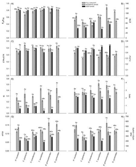 The ɸPSII is intrinsically associated with the noncyclic electron transport rates, so that the lower ɸPSII observed for C. guianensis in FS and T. serratifolia in DS affected the ETR and, consequently, the photosynthetic rate in these environments. This parameter measures the proportion of light absorbed by the PSII-associated chlorophylls that are effectively used in photochemical processes, and, as well as the Fv/Fm, can be used as an indicator of plant performance under different types of stress [,].