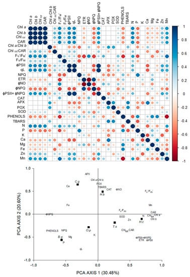 The PCA for MS explained 51.08% of the variation of the data, and in axis 1 is contained 30.48% of the power of explanation. With this axis the content of pigments, Fv′/Fm′, ɸPSII, ETR, N and Mn content, and ɸPSII=ɸNPQ were strongly correlated. In this axis, the strong and negative correlations were with the content of phenols and ɸNPQ. Axis 2 explained 20.60% of the data and was strongly related to APX and POX activity, Chla: Chlb, and Ca content. A negative correlation was observed with qL (Figure 3).