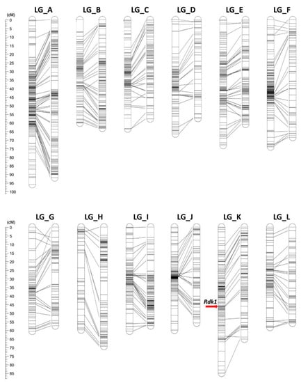 Genetic linkage maps of Castanea spp. ‘Bouche de Bétizac’ (Bouche) and ‘Madonna’ (Madonna) cultivars. Linkage groups (LGs) of Bouche (female parent, LGs on the left) and Madonna (male parent, LGs on the right) were aligned using markers selected on common scaffolds. The linkage group names were assigned according to the C. mollissima genetic consensus map []. The left rulers express the length of the LGs in cM. A red arrow indicates the mapping position of the quantitative trait loci (QTL) region of 1.04 cM linked to the trait of resistance to Dryocosmus kuriphilus (Rdk1 QTL region).