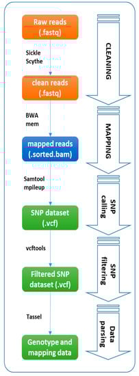 SNPs and indels were identified according to Acquadro et al. [] (Table S3). Illumina reads were de-multiplexed on the basis of the Illumina TruSeq index. Raw reads were analyzed with Scythe (https://github.com/vsbuffalo/scythe) for filtering out contaminant substrings and Sickle (https://github.com/najoshi/sickle), which allows the removal of reads with poor quality ends (Q < 30). Alignment to the reference C. mollissima genome (Cm_v1.1_scaffolds.fasta) [] was carried out using a BWA aligner [] (e.g., mem command) with default parameters and avoiding multiple-mapping reads. SNP and indel mining was conducted by adopting a Samtools-based pipeline [] as presented in Figure 2 and in File S1; in particular, the mpileup command was adopted with default parameters except for (1) minimum mapping quality (Q = 20) and filtering out multimapping events (−q > 1). SNPs and indels (hereafter called SNPs) detected from the alignments were filtered with VCFtools (version 0.1.13; parameters: –minQ 20 –max-missing-count 20 –minDP 10 –maf 0.1 –maf 0.9 –min-allele 2 –max-allele 2), as presented in Figure 2 and in File S1.
