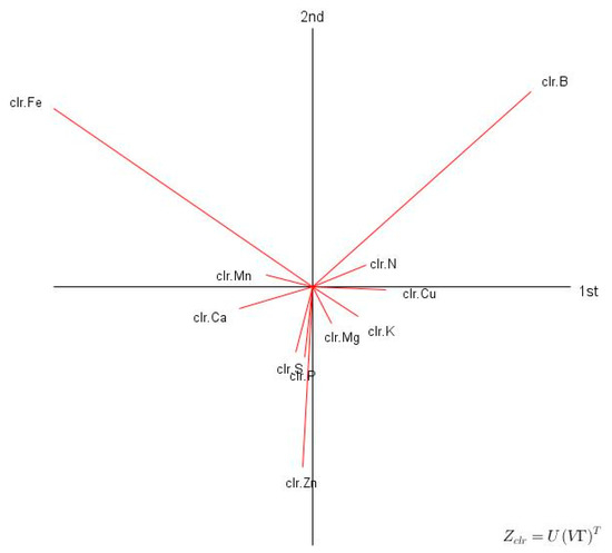 While nutrients interact with each other, clr or ilr variables can project them into the Euclidean hyper-space of plant nutrients to avoid disastrous conclusions. The compositional methods view nutrient compositions as entities, i.e., unique combinations of nutrients in a tissue. Nutrients interact between them in several ways [17,51], and this can be handled by log ratio transformations [37]. The distance between two equal-length compositions is computed as a Euclidean distance using clr or ilr variables. The clr differences can rank nutrients in the order of their limitation to yield.
