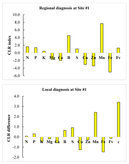 We selected successful neighbors showing DBH > 5 cm at the clone × age interaction level and where nutrient requirements were most parsimonious to minimize cost of adjusting nutrient management. Regional diagnosis using clr standards in Table 5 and local diagnosis of the two defective compositions are illustrated in the form of histograms in Figure 2 and Figure 3. Close successful neighbors reached a DBH of 5.43–5.44 cm compared to 4.06 cm and 1.71 at sites #1 and #2, respectively, indicating high potential to boost plant growth using appropriate corrective measures.