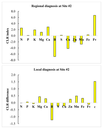At site #1, there was relative Mn excess at both regional and local scales. At the regional scale, B and N ranked second and third in relative excess, while Fe, Zn and Cu ranked in a descending order of relative nutrient shortage. At the local scale, S and B ranked second and third in relative excess, while Fe and Cu ranked in a descending order of relative nutrient shortage. As a result, Fe, Zn and Cu should be added following regional diagnosis at site #1, while only Fe and Cu would be required following local diagnosis. At site #2, B appeared to be in relative shortage at both regional and local scales. At the regional scale, N and Ca showed relative excess, while B and Cu ranked in a descending order of relative nutrient shortage. At the local scale, only B appeared to limit yield. As a result, B and Cu should be added and N reduced following regional diagnosis at site #2, while only B would be required according to local diagnosis.