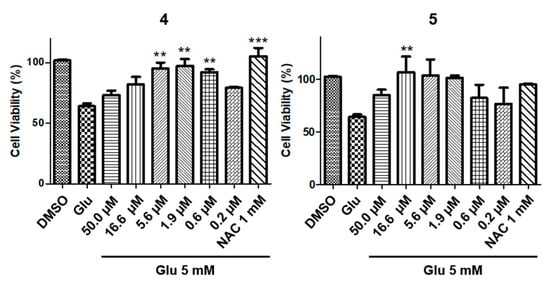 Protective effect of 4 and 5 against glutamate-induced toxicity in HT22 cells (** P < 0.05, and *** P < 0.0002).