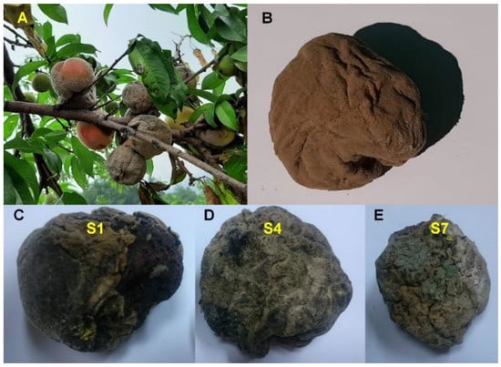 Peach fruits infected by fungi and the mummified peach fruits. (A) Peach fruits infected by fungi clinging to the peach branch. (B) Brown rot on a peach fruit. Mummified peach fruit samples, S1 (C), S4 (D), and S7 (E) used for next-generation sequencing.