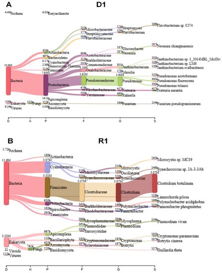 In order to annotate sequenced reads fast, we initially used KRAKEN 2 program which assigns taxonomic labels of sequencing reads using k-mer-based approach with an efficient memory usage [15]. The KRAKEN 2 performed nucleotide search against nucleotide database (kraken2-microbial database) (September 2018, 30GB). The KRAKEN 2 programs revealed diverse microorganisms including fungi, bacteria, viruses, and viroids in the mummified peach fruits. For example, several proteobacteria such as Pseudomonas spp. were dominantly identified in D1 library (Figure 2A) while a large number of reads associated with Clostridium botulinum were identified in R1 library (Figure 2B). As compared to D1 and R1 libraries, other four libraries contain a large number of reads associated with Botrytis cinerea followed by Fusarium pseudograminearum (Figures S1 and S2). In addition, several proteobacteria such as Pantoea ananatis, Aspergillus oryzae, Pseudomonas tolaasii, and Kosakonia cowanii were also identified in D4, R4, D7, and R7 libraries (Figures S1 and S2). In D1 and R1 library, bacteria; reads were dominant whereas fungal reads were dominant in D4, R4, D7, and R7 libraries. However, the fungal metagenome and metatranscriptome results from KRAKEN2 were not consistent with other experimental data demonstrating that mummified peach fruits should be dominated by Monilinia species. In fact, the microbial database used for KRANEN 2 did not contain enough sequence data for plant fungal metagenome and metatranscriptome analyses. Instead of using KRAKEN 2, we carried out BLASTX search against NCBI’s non-redundant (NR) protein database for sequence annotation using DIAMOND program with default parameters [16]. The BLASTX search was much slower than KRAKEN 2; however, the NR protein database contains a large number of sequence data including fungi and BLASTX using translated search provided accuracy for taxonomic classification. The DIAMOND BLASTX results were imported into MEGAN6 for taxonomy classification [17].