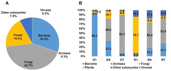 In order to observe the taxonomy overview of identified organisms, we combined all annotation results from six libraries according to domain using MEGAN6 program. As we expected, the reads associated with fungi (42.7%) were abundantly present followed by bacteria (30.2%) and plants (19%) (Figure 3A). In addition, we identified several reads associated with other eukaryotes (7.6%), archaea (0.3%), and viruses (0.3%). Next, we examined the proportion of identified organisms in each library according to domain (Figure 3B). Interestingly, D1 and R1 libraries were derived from the identical S1 sample, bacterial reads (89.1%) were dominantly present in D1 library while reads associated with plants (79.1%) were dominantly present in R1. By contrast, fungal reads were abundantly identified in other four libraries followed by bacterial reads. Of six libraries, the proportion of fungal reads (83.3%) was very high among six libraries.