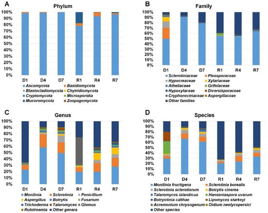 Taxonomy classification of identified fungi from six different libraries. Results of BLASTX using Diamond were subjected to MEGAN6 to classify taxonomy of identified organisms according to phylum (A), family (B), genus (C), and species (D). For simplicity, only a proportion of representative fungal taxonomy was visualized.
