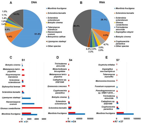 Next, we selected top ten fungal species in sample based on assigned read number. In S1 sample, the number of reads associated with M. fructigena was very high in both DNA (4161 reads) and RNA (2488 reads) (Figure 5C). Interestingly, a large number of reads associated with G. cerebriforme was identified from the RNA library (5515 reads) whereas only 38 reads for G. cerebriforme were identified in the DNA library. Similarly, the number of reads associated with Hanseniaspora uvarum (3379 reads) and Lipomyces starkeyi (2384 reads) in the DNA library was much higher than that in the RNA library (Figure 5C). In both S4 and S7 libraries, the number of reads associated with M. fructigena was two times higher in DNA libraries than that in RNA libraries. Several additional fungal species such as Cryphonectria parasitica, Emmonsia crescens, Cadophora sp. DSE1049, Melampsora larici-populina, Metschnikowia bicuspidate, and Trichoderma atroviride were identified from S4 sample (Figure 5D). In S7 library, we identified Pseudogymnoascus sp., Fusarium oxysporum, Marssonina brunnea, Talaromyces marneffei, Aspergillus saccharolyticus, and Oxytricha trifallax (Figure 5E).