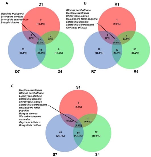 We compared the list of identified fungal species among different libraries. For that, we selected fungal species in each library based on the number of assigned read more than 100. As a result, we identified 11, 25, and 39 species from D1, D4, and D7 library, respectively (Figure 6A). Four fungal species including M. fructigena, S. borealis, S. sclerotiorum, and B. cinerea were commonly identified in the three DNA libraries. In addition, there were 19 fungal species commonly identified in both D4 and D7 libraries. Each DNA library has unique fungal species such as seven species (D1), six species (D4), and 20 species (D7). A total of seven fungal species including G. cerebriforme, M. fructigena, Stylonychia lemnae, Melampsora larici-populina, S. borealis, S sclerotiorum, and Oxytricha trifallax were commonly identified in three RNA libraries (Figure 6B). The number of commonly identified fungal species (59 species) between R4 and R7 was very high. Except R1 (one species), R4 (30 species) and R7 (20 species) have many library specific fungal species. Next, we compared the list of identified fungal species among three different samples (Figure 6C). A total of 11 fungal species were commonly identified in all three samples. The number of sample specific fungal species was five species (S1), 32 species (S4), and 43 species (S7). Again, many fungal species (79 species) were commonly identified in both S4 and S7 samples.