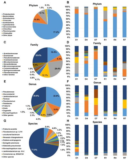 Not only fungi but also diverse bacteria were identified by DNA shotgun sequencing and RNA-sequencing (Table S2 and Figure 7). According to phylum, Proteobacteria (77.2%) was the dominant bacterial phylum followed by Bacteroidetes (10.8%), Actinobacteria (9.1%), and Firmicutes (1.5%) after combining all reads associated bacteria (Figure 7A). The proportion of Proteobacteria in each library ranged from 52.7% (R1) to 92.4% (D7). Actinobacteria was the second dominant bacterial phylum in D4 (16.4%), R1 (27.7%), R4 (13.6%), and R7 (7.2%) (Figure 7B). Bacteroidetes was the second dominant bacterial phylum in D1 (15.4%) and D7 (4.7%). After combining all bacterial reads according to family, Pseudomonadaceae (24.4%) was the dominant family followed by Acetobacteraceae (16.5%), Oxalobacteraceae (12.1%), Erwiniaceae (6.3%), and Flavobacteriaceae (5.3%) (Figure 7C). The Pseudomonadaceae was the dominant family only in D1 library (34.8%) whereas Acetobacteraceae was the dominant family in D4 (42.5%) and D7 (56.1%) libraries (Figure 7D). Interestingly, three different bacterial families were dominant in R1 (Microbacteriaceae), R4 (Comamonadaceae), and R7 (Erwiniaceae). Pseudomonas (30.8%), Gluconobacter (9.9%), Janthinobacterium (9.6%), Pantoea (6.6%), and Flavobacterium (4.0%) were major bacterial genera after combining all identified reads associated with bacterial genera (Figure 7E). In D1 library, Pseudomonas (42.4%) was the dominant followed by Janthinobacterium (15.5%) (Figure 7F). The genus Guconobacter was dominantly present in D4 and D7 libraries. In D7 library, Guconobacter (32.6%), Asaia (27.5%), and Pantoea (22.4%) were major genera. In R7, Pseudomonas (24.5%) and Pantoea (28.2%) were major genera. At the species level, numerous bacterial species were identified. Of them, the representative bacterial species were Frateuria aurantia, Flavobacterium sp. CJ74, uncultured bacterium, Neoasaia chiangmaiensis, and Robbsia andropogonis in all six libraries (Figure 7G). In D1, Frateuria aurantia was the main bacteria species whereas Klebsiella pneumonia was dominant bacteria species in D4 and D7 (Figure 7H). Uncultured bacterium was dominant in three RNA libraries.