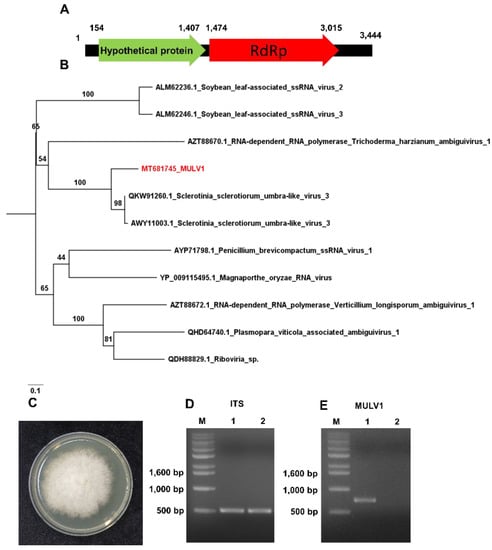 Genome organization and phylogenetic relationship of novel mycovirus (MULV1). (A) Genome organization of MULV1. Numbers indicate positions of open reading frames (ORFs). (B) Phylogenetic relationship of MULV1 and closely related viruses. The phylogenetic tree was inferred by IQ-TREE with the maximum likelihood method and 1000 bootstrap iterations. (C) Isolated Monilinia fructigena from the mummified peach fruit (S4 sample) grown on potato dextrose agarose (PDA) medium. (D) Identification of M. fructigena by PCR using internal transcribed spacer (ITS) primers. M indicates DNA ladder. 1 and 2 indicate Monilinia species from the mummified peach fruit (S4 sample) and other peach fruit, respectively. (E) RT-PCR results using MULV1 specific primers. The amplicon size is 737 bp.