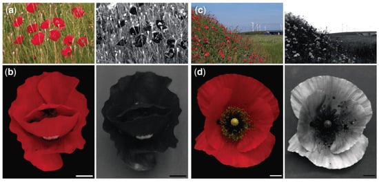 - Van der Kooi, C.J.; Stavenga, D.G. Vividly coloured poppy flowers due to dense pigmentation and strong scattering in thin petals. J. Comp. Physiol. A 2019, 205, 363–372. [Google Scholar] [CrossRef]