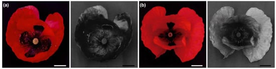 RGB and UV images of flowers of P. rhoeas collected in the North Mediterranean. (a) A P. rhoeas flower that reflects negligibly in UV. (b) A P. rhoeas flower with appreciable UV reflectance. Scale bars: 1 cm.