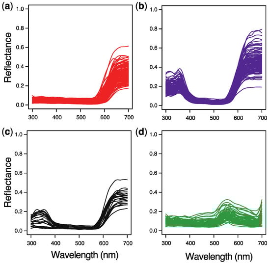 Reflectance spectra of flowers and foliage of P. rhoeas collected in the field and measured with a spectrometer setup with two optical fibers. (a) Reflectance spectra of flowers collected in the East Mediterranean (n = 124). (b) Reflectance spectra of flowers collected in Central Europe (n = 116). (c) Reflectance spectra of flowers collected in the North Mediterranean (n = 22). (d) Reflectance spectra of green foliage (n = 77).