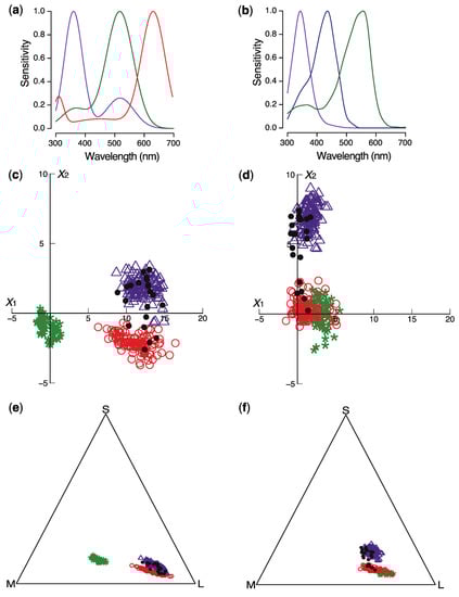 Flower colors were plotted in two chromaticity diagrams using the receptor noise-limited (RNL) color-opponent model and the Maxwell triangle. According to the RNL model, colors can be depicted as points in a chromaticity diagram, where the discriminability between colors is given by the Euclidean distance between points (Figure 4c,d). The greater the distance, the more reliable is the discrimination [,]. This model accurately describes color discrimination in the honeybee [,] and in a number of other animals [,,], indicating its value for psychophysical estimates of color discrimination. When I(λ) is the illumination spectrum for a flower or leaf with reflectance spectrum S(λ) (Figure 3), the quantum catch, Qk, of the short- (S), middle- (M), and long-wavelength (L)-sensitive photoreceptor k (k = S, M, L) with spectral sensitivity Rk(λ) (Figure 4a,b) is