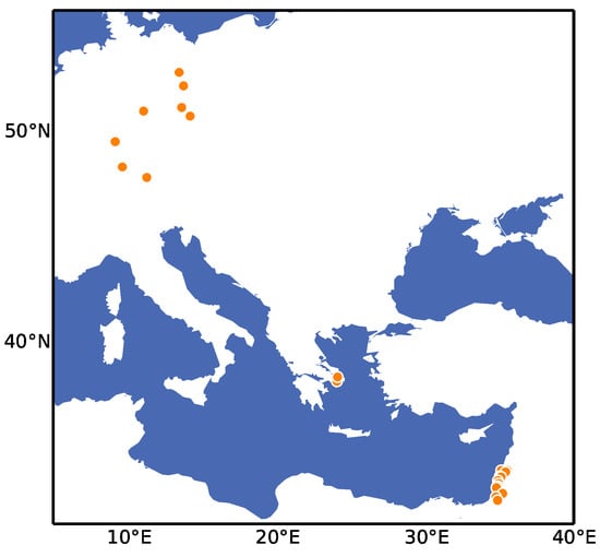 A map of the sites where flowers of P. rhoeas were collected for our study. Sites include ten locations in the East Mediterranean (Israel), two locations in the North Mediterranean (Greece), and eight locations in Central Europe (Germany).