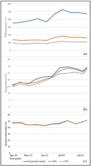 The mean daily temperature increased from the transplant to the beginning of the last cropping season in July: in the unshaded plots, it was 5.93% and 15.01% higher compared to 50% and 79% shading respectively. The reduction in PAR values obtained in the current experiment are consistent with previous studies [28,29,30].