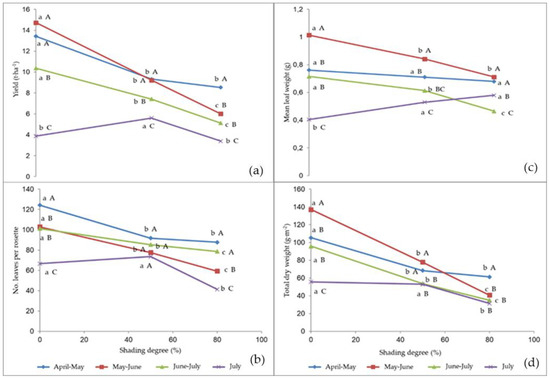 The interaction between the cropping season and the shading degree was significant on the yield parameters and plant dry matter (Figure 2a–d).