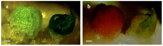 Under non-selective conditions, transformed and non-transformed segments compete in the same space for shoot development, and non-transgenic events would be more competent to regenerate and prevailed over the transformed segments [,]; moreover, the selection of transgenic plants directly by molecular analyses could result in gene silencing [,] and in laborious, expensive, and time-consuming screenings. To avoid this risk, reporter markers, such as β-glucoronidase (uidA or GUS), which needs the extractive assay to be detected, and green fluorescent protein (GFP, Figure 1), a viable reporter gene, can be used to rapidly screen and select transformed shoots [,,].
