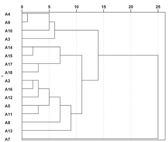 The dendrogram suggests a classification in four groups. The first group on the upper part comprising accessions A3, A4, A9 and A10 had higher furocoumarin contents. The second group gathering A14, A15, A17 and A18 had medium contents of furocoumarins and higher contents of prenylated coumarins, especially trans-suberenol. The third group with A2, A5, A8, A11, A12, A13 and A16 appeared rather low in furocoumarins. The last group at the bottom is represented by accession A7 alone. This accession was generally low in all compounds. No correlation could be found with geographic origins of the samples.