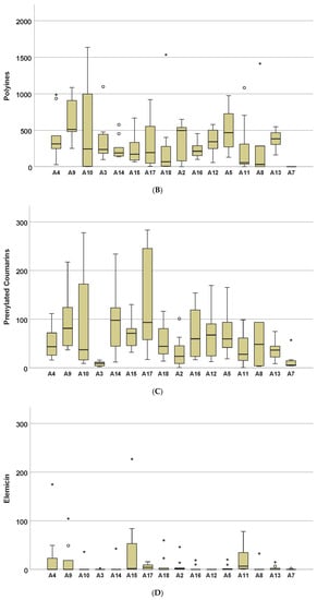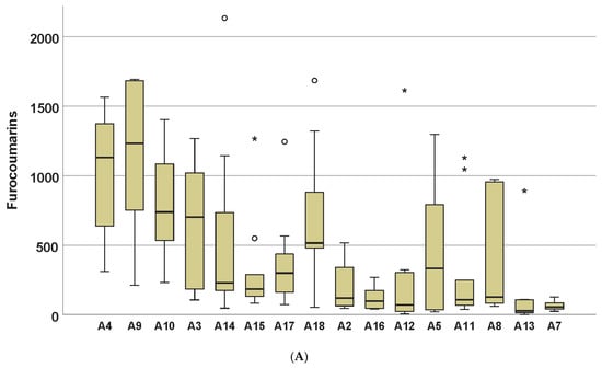 Boxplots presenting the variability of compound classed in 16 accessions (µg/g). * and o mark outliers. Order of accessions according to hierarchical cluster analysis (HCA) analysis in Figure 1. (A): furocoumarins; (B): polyines; (C): prenylated coumarins; (D): elemicin.