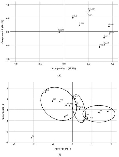 On the loading plot of the first two components, all compounds but suberenol had a positive component 1 loading, and the highest loadings were recorded for the furocoumarins. Falcarindiol had a high component 2 loading. The compounds falcarinol, trans-suberenol and elemicin, which occurred rather in low concentrations in the sample, had lower loadings on both components. On the scoring plot comparing the accessions, a grouping partially similar to those suggested by HCA could be found. Accession A7 having lowest contents of active compounds was isolated on the lower left quadrant. The third group in HCA (A2, A5, A8, A11, A12, A13 and A16) with a high ratio of falcarindiol to furocoumarins appeared mainly in PCA on the upper left quadrant, while the remaining accessions had all positive factor 1 values. In this plotting, the highest factor 1 value was assigned to A9, which was the accession with the highest total active compound content (Table 2).