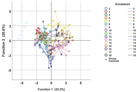 Finally, to visualize the relation between individual samples of the accessions a canonical discriminant analysis (CDA) was performed. In this multivariate analysis, samples had to be assigned to the accessions as predefined groups. Figure 4 plots the values of the first two discriminant functions for the samples and the corresponding accessions. Some accessions were well separated as, for instance, A3, A12 and A17, but there were also many overlaps. This can be attributed to the high variability within the accessions. Altogether, 63.8% of the samples were correctly classified to their accessions.