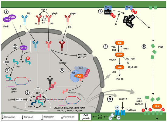 Once the SCFTIR1/AFB complex binds auxin, it interacts with and ubiquitinates the auxin signalling repressors AUX/IAAs, which are subsequently degraded [28]. This releases AUX/IAA repression of auxin related gene expression and cell growth [28]. Recent studies have established that photoreceptor activation by light prevents AUX/IAA degradation and thereby lessens the auxin induced growth response [29,30,31].