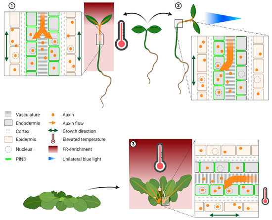 - Keuskamp, D.H.; Pollmann, S.; Voesenek, L.A.C.J.; Peeters, A.J.M.; Pierik, R. Auxin transport through PIN-FORMED 3 (PIN3) controls shade avoidance and fitness during competition. Proc. Natl. Acad. Sci. USA 2010, 107, 22740–22744. [Google Scholar] [CrossRef] [PubMed]