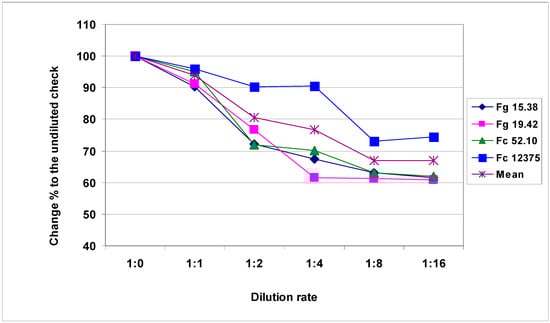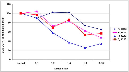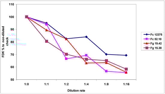 DON contamination resulted in significantly larger differences than shown in the DI of FDK. The mean for Fc 12375 was 22.40 mg/kg, and the value for the least aggressive Fg 15.38 was 3.36 mg/kg (Table 7A). The reduction of DON was different: The most aggressive isolates suffered a 35% reduction, and the less aggressive isolates showed reductions of 47%, 34.5%, and 57%; these values were significantly higher than those of DI and FDK. However, Fc 12375 did not suffer a significant loss in aggressiveness for dilutions up to 1:4 dilutions. For the other dilutions, a reduction was seen much earlier. The correlations between isolates and the different dilution grades varied (Table 7B). The higher values for Fc 12375 did not significantly correlate with the data of the other isolates. The relative DON data showed high variability in isolate response to dilution. Figure 6 presents the decrease of the DON contamination at different dilution stages, in which the most aggressive isolate followed the pattern of DI and FDK. The isolate Fc 12375 did not significantly correlate with any of the data of the other less aggressive isolates. However, the correlations between the less aggressive isolates were all significant. Additionally, the three least aggressive isolates were divided: Two isolates were close to each other, but isolate Fg 19.42 followed a different function. It appeared that the 1:1 dilution did not greatly influence the aggressiveness measured by DON contamination. Thus, doubling the dilution (i.e., 1:1) was tolerable when an insufficient amount of inoculum was produced (Figure 6). The 1:1 dilution had a smaller effect, and on average showed a non-significant influence on DON production, with greater differentiation seen afterwards. The Fc 52.10 and Fg 15.38 isolates produced very similar responses to dilution, despite three-fold differences in DON contamination. This indicates that the DON data cannot be extrapolated from the DI or FDK data.