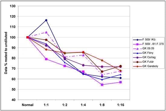 The cultivars showed a greater reaction difference to the dilution rate measured by FDK (Table 6A). The resistance differences increased to more than 5-fold compared to the 3.5-fold increase of DI. No significant difference was found between GK Csillag, GK Fény, and GK 09.09. However, the difference between the most and second-most susceptible genotype was much larger than was seen for the visual symptoms. The correlations between cultivar responses to dilutions (n = 7) showed a variable picture (Table 6B). GK Garaboly presented significant correlations with the two other cultivars. The others showed a significant relationship at different significance levels. The mean responses to the dilution rates differed significantly. However, no significant difference was found between means of 1:2 and 1:4 dilutions, or 1:8 and 1:16 dilutions. The data for the relative FDK values at different dilution levels compared to the non-diluted original concentrations are shown in Figure 5. The smallest difference was found between the non-diluted and 1:1 dilution rate. When the quantity of suspension was less than required, a dilution up to this rate did not cause a significant change in aggressiveness. There was a clear distinction between the susceptible cultivars and those that are more resistant, namely, the susceptible cultivars showed a smaller decrease at different dilution rates (Figure 6). The most resistant genotype showed an increase at 1:1 dilution; thereafter, however, a rapid decrease was registered. It appears that the effect of the dilution depends both on aggressiveness and genotype resistance. At a dilution of 1:1, the data varied between 80% and 108%, at 1:4 between 60% and 90%, and at 1:16 the two previously mentioned groups diverged significantly, and the difference was smaller (approximately 10%).