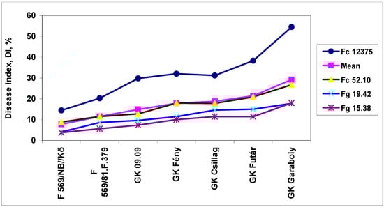 The genotypes also reacted differently to the dilution rates (Table 4). The resistance difference between genotypes was larger than three-fold for the means across dilutions, but different at different dilution rates. The mean dilution responses were very similar for DI data, as presented in Table 2. It appeared that the least dilution (1:1, 6.0% decrease) did not drastically reduce the aggressiveness. It is probable that such a dilution is tolerable when there is a shortage of inoculum, for example. Higher dilutions caused a significantly higher reduction in aggressiveness; at 1:16 dilution, there was a 33% mean reduction across genotypes. Therefore, the aggressiveness resulting from a higher dilution rate can be unpredictable. The cultivar differences were four-fold, and a decreasing trend following increasing dilutions was found in all cultivars. To separate the data from the resistance level, we set the performance of the non-diluted response to 100%. The dilution rate caused the largest difference at a 1:1 ratio, which yielded responses of between 79% and 116% (Figure 2), with a difference between maximum and minimum values of between 12% and 20%. Overall, this data clearly shows that there is an interaction between the resistance level and the dilution rate. However, this does not explain why the most susceptible cultivars, GK Futár and GK Garaboly, behave differently. An increase was recorded at a 1:1 dilution for the two genotypes, but these were not among the most susceptible. For the other genotypes, only a reduction was detected. It appears that other effects were also influencing the reactions. The reactions of the genotypes to the different isolates exhibited parallel running curves: The less aggressive isolates showed less convincing genotype differences, but the most aggressive isolates produced a much better differentiation of the genotypes (Figure 3).